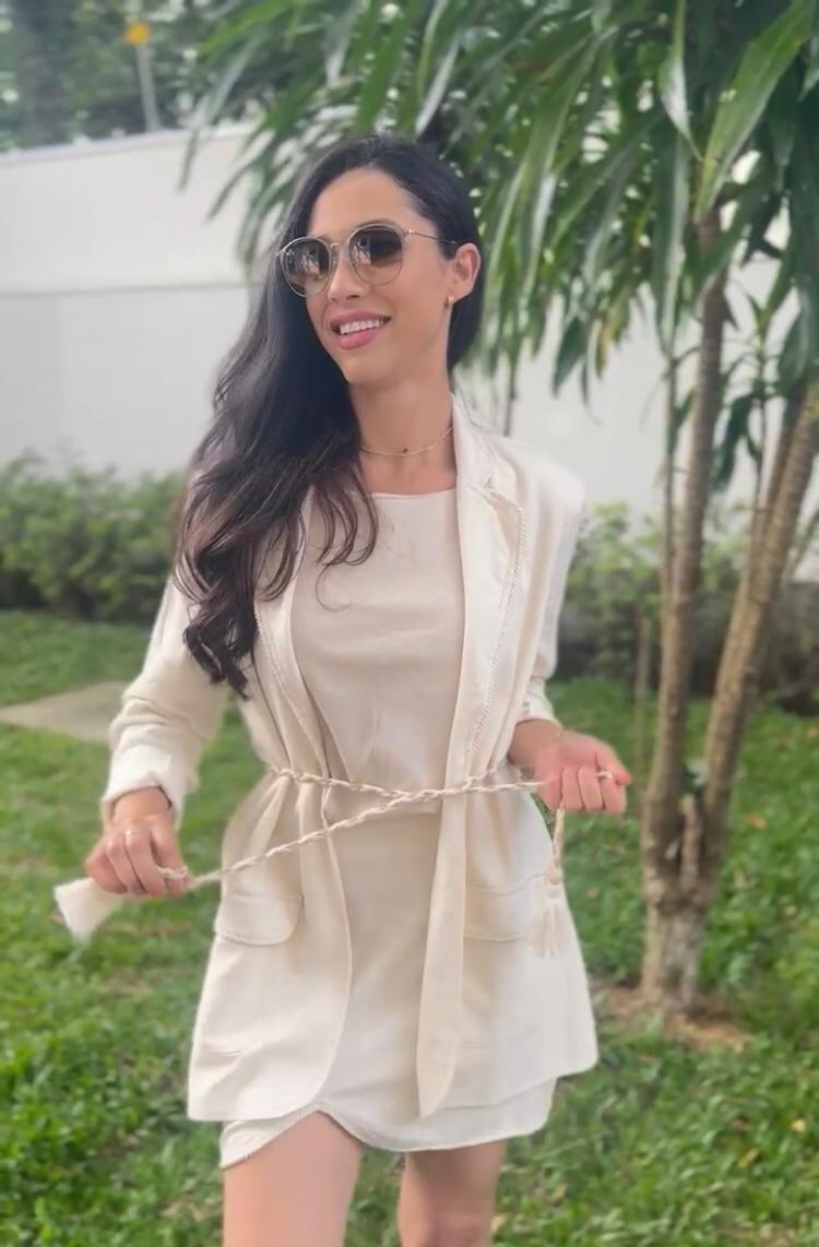Saia em viscolinho com recorte assimétrico e detalhes.