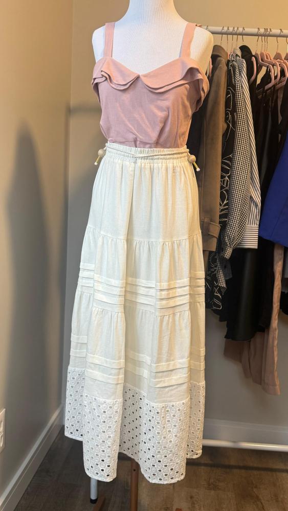 Saia longa com cós em elástico, com cordinha para ajuste.