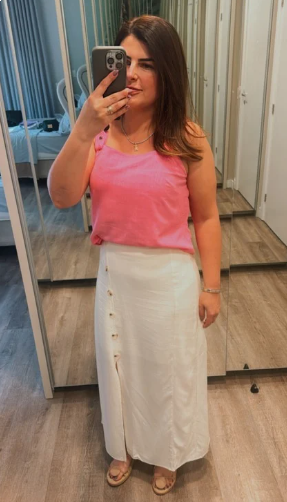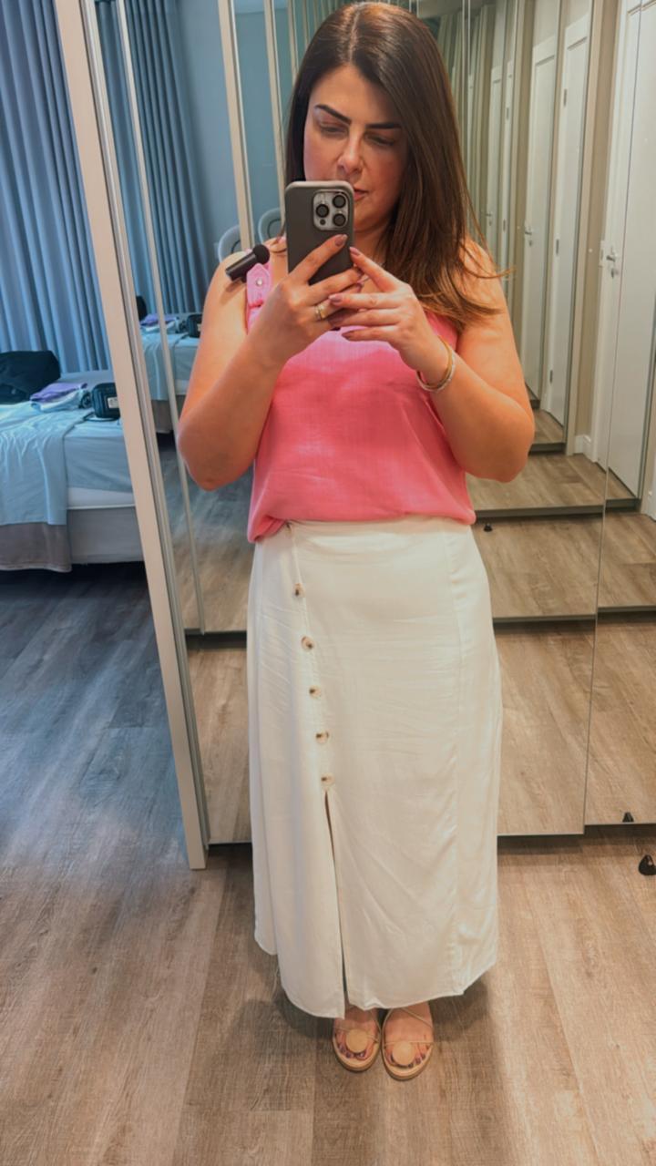 Saia midi em viscolinho, fenda lateral e botões tartaruga são o charme desta saia.